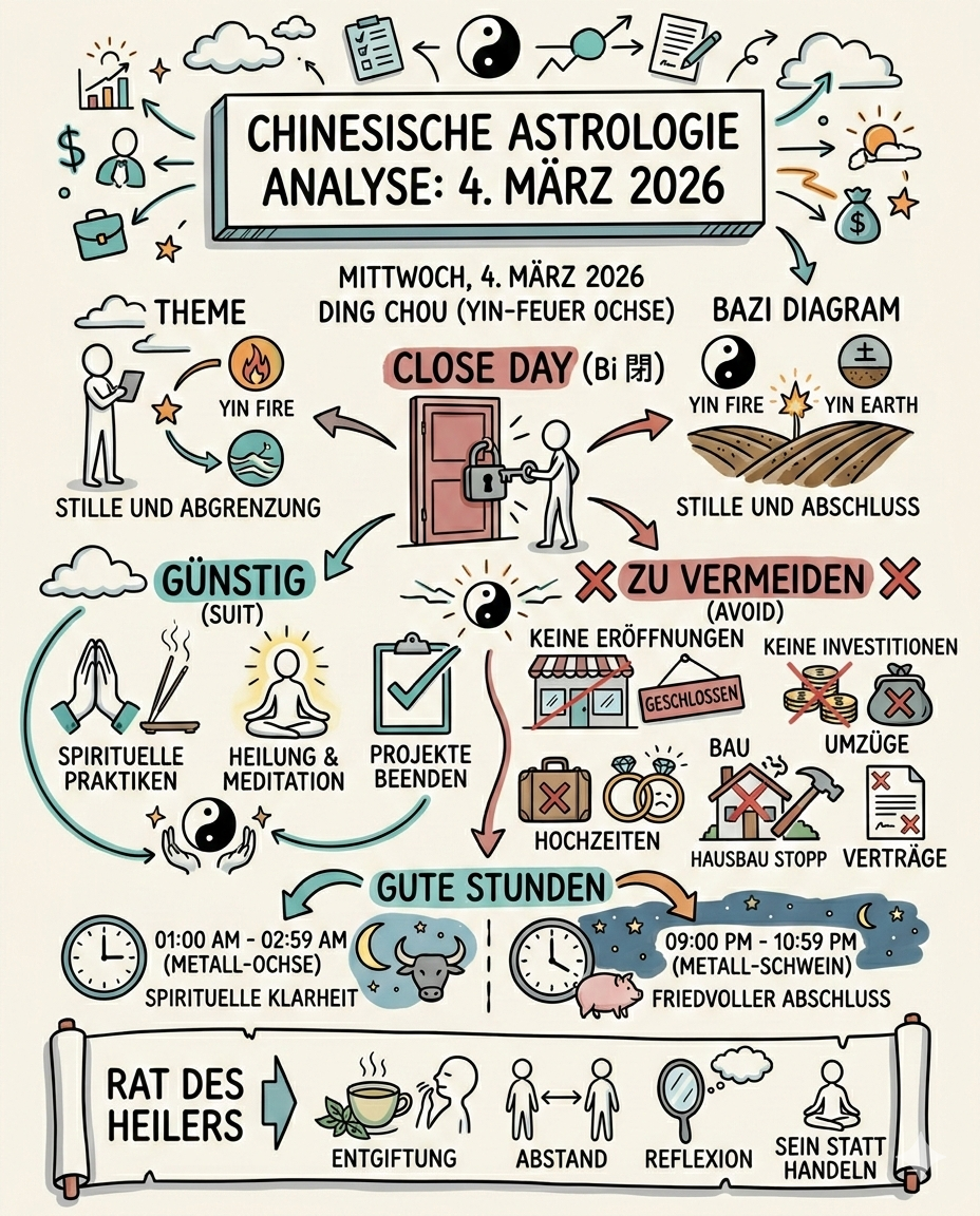 Seid gegrüßt, Suchende des Lichts und des Gleichgewichts. Ich habe die Zeichen des Himmels und der Erde für diesen speziellen Tag gelesen. Der heutige Tag steht unter dem Zeichen des Ding Chou (Yin-Feuer-Ochse). Es ist ein Tag, der uns lehrt, dass wahre Stärke oft in der Stille und im Abschluss liegt, nicht im Vorwärtsstürmen.