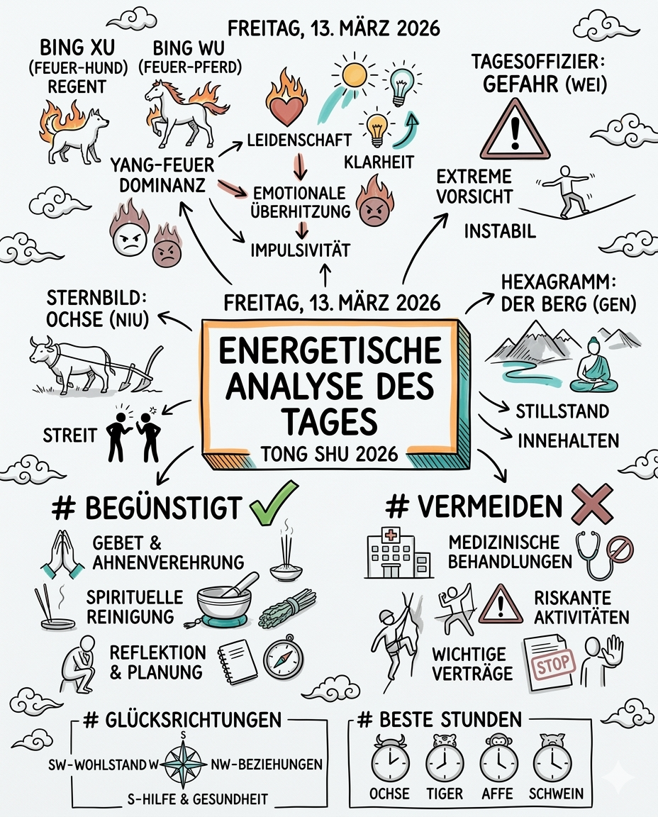 Der heutige Tag wird vom Bing Xu (Feuer-Hund) regiert. In Kombination mit dem Jahr des Bing Wu (Feuer-Pferd) erleben wir eine enorme Dominanz des Yang-Feuers. Dies deutet auf eine Zeit großer Leidenschaft, Klarheit und spiritueller Erleuchtung hin, birgt aber auch die Gefahr der emotionalen Überhitzung und Impulsivität.