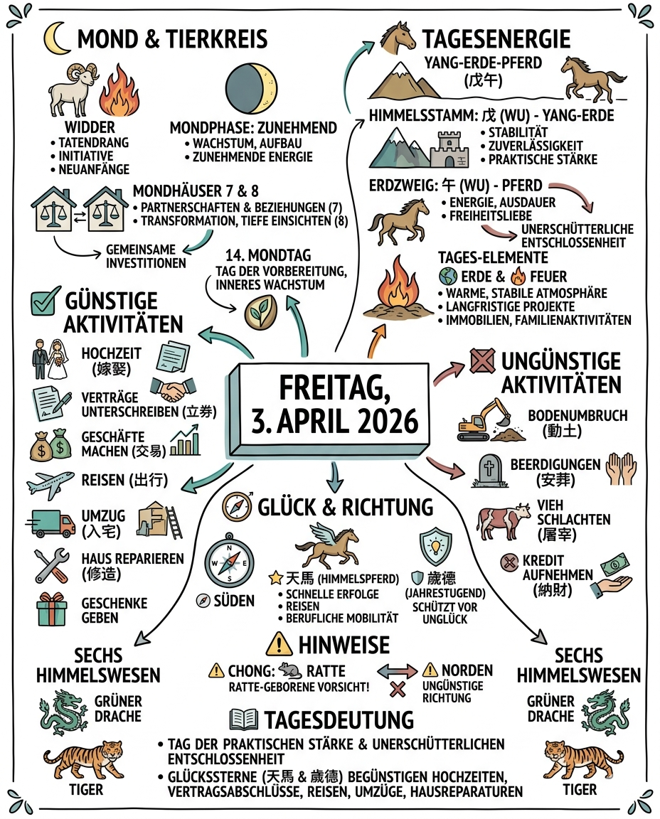 Der Tag des Yang-Erde-Pferdes (戊午) ist ein Tag der praktischen Stärke und unerschütterlichen Entschlossenheit. Die Kombination aus festem Berg (Yang-Erde) und dem energiegeladenen Pferd schafft eine Energie, die besonders für Hochzeiten, Vertragsabschlüsse, Geschäftsreisen, Umzüge und Hausreparaturen günstig ist.
