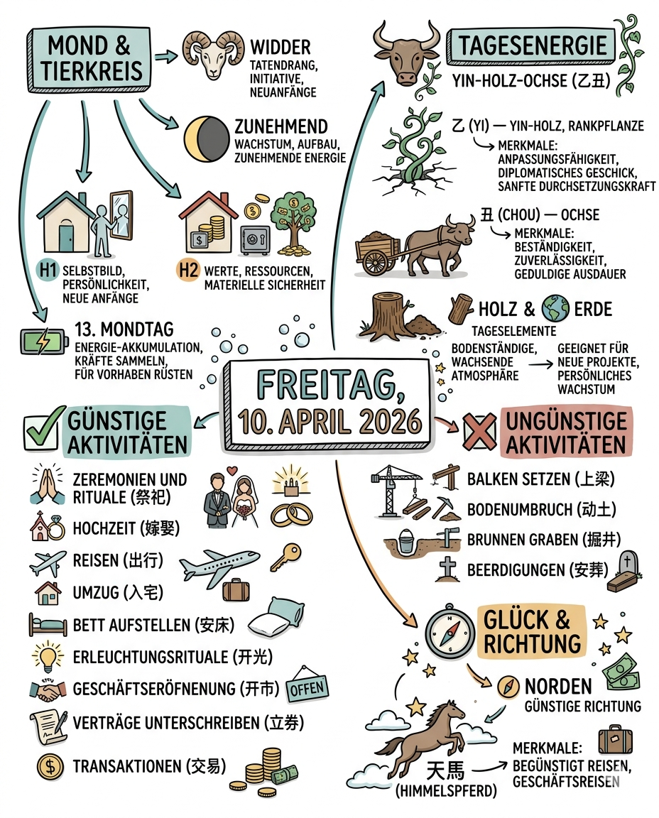 Der Tag der Yin-Holz-Ochse (乙丑) bringt eine ruhige, beständige Energie mit sich. Wie die Rankpflanze, die sich beharrlich durch die Erde schängt, so sind heute Geduld und Ausdauer die Schlüssel zum Erfolg. Die Kombination aus dem diplomatischen Yin-Holz und dem zuverlässigen Ochsen macht diesen Tag besonders geeignet für Hochzeiten, Reisen, Geschäftseröffnungen, Vertragsabschlüsse und Umzüge.