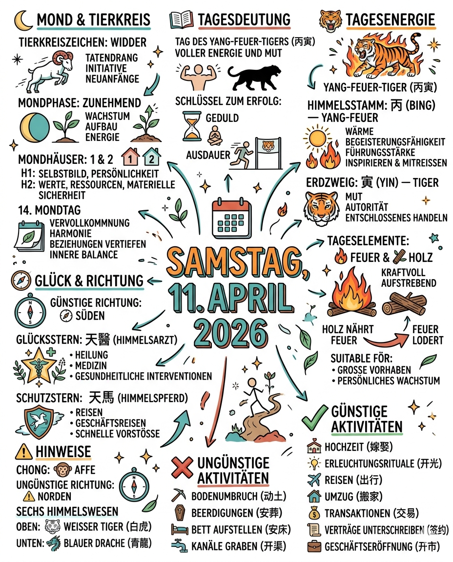 Der Tag des Yang-Feuer-Tigers (丙寅) ist ein Tag voller Energie und Mut. Wie die Sonne am Himmel, die alles erhellt, so wirkt die Yang-Feuer-Energie auf die Welt — inspirierend, wärmend und belebend. Die Kombination aus der strahlenden Sonne und dem mutigen Tiger macht diesen Tag besonders geeignet für Hochzeiten, Erleuchtungsrituale, Reisen, Geschäftseröffnungen und mutige Vorhaben.